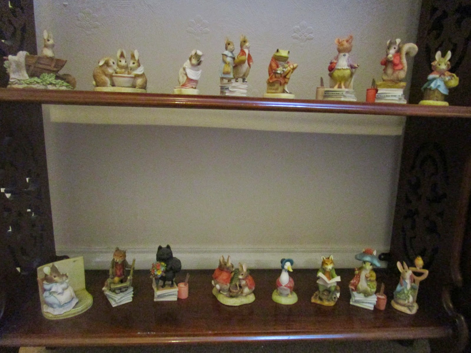 Today I nipped into town to sort out the wrong order delivery and then went to the auction house. Got a bidding number and had another look round. Darren joined me for the start. I bid on a couple of things that I didn't get. There was a box of beads and broken jewellery and other odds and ends. There was a lady there bidding for several lots with beads and jewellery, and that box went for about £65. I was only going to get some supplies for the bead group so wasn't intending to go very high. But I decided to bid on the Beatrix Potter figures and got them at a better price than I thought they would go for. Also bit on a lot of playing cards and notebooks for Darren which I got and he is very pleased with. When I got home I put the figures on the walnut book rack that I got a few weeks ago. I had two empty shelves as I was still deciding what to display on there.