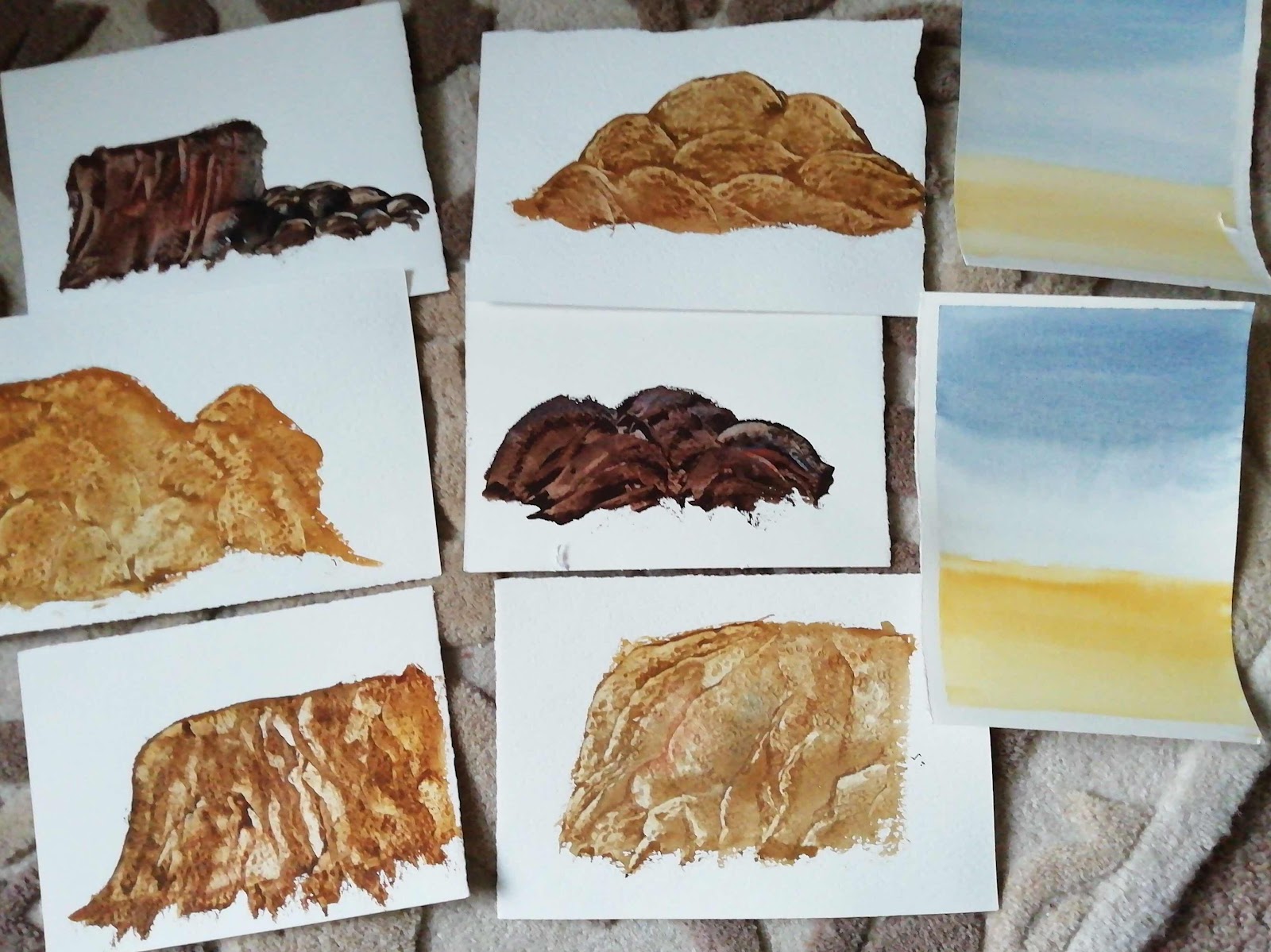 I was out pretty early as I was on the queue outside the doctors surgery at about 8.15 am. I have never had another surgery that makes you wait outside, whatever the weather, until the appointments start! Saw a lovely doctor who took his time, asked lots of questions and examined my hands. He said the it is carpel tunnel and the options were medication or physio and possibly wrist splints. I said I would prefer not to go down the painkiller route so he gave me the number for the self referral physio department. He wants to see me in the month and says if that doesn’t work there are other options, injections or as a last resort surgery. I had a cuppa with Tina when I got home and phoned the physio, it is a telephone consultation first and made an appointment for the call this afternoon. Then I set off for the watercolour workshop, this week was cliffs and beaches, I found it interesting but also quite challenging, will make sure to get a lot of practice before the next session! We learnt about forming cliffs and rocks and then graded washes for sky and sand.after that we had a try at a picture. Will post them even though I am not overly happy with the results.