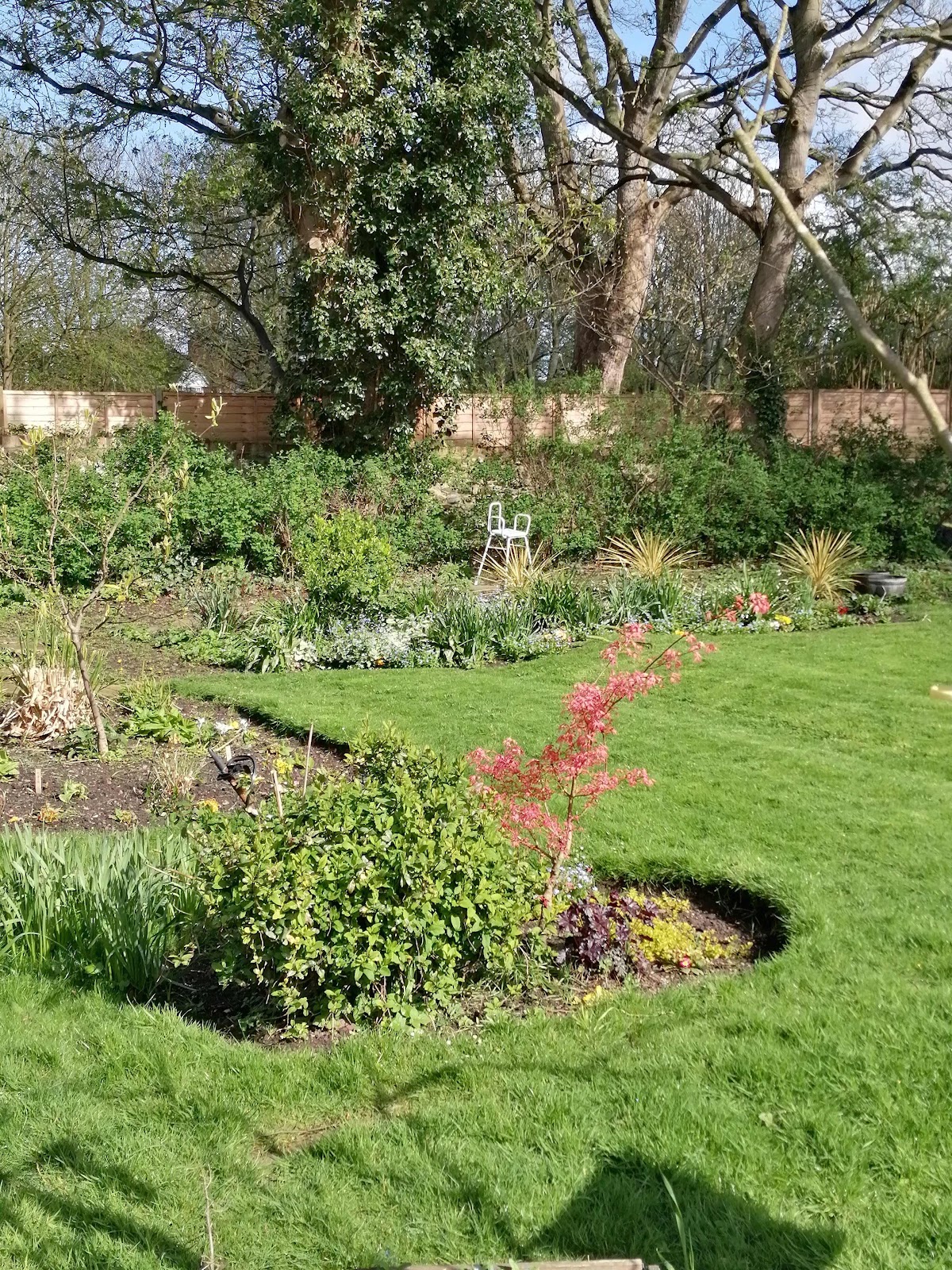 I went out early to post a couple of letters, it was raining, that nasty mizzle and it has been on and off all day with a cold wind. A bit before ten Angela came round and we went over to Bemora and had breakfast. Darren is off and Tina had a busy day so Darren drove me up to Freeport to take my pottery paints back and collect a new box with more colours. That means ai will be able to go up to paint on Thursday on the bus to save Caroline having to come and collect me, as I won’t be able to carry paints as well as still using a crutch. We went into the cafe and Darren had some lunch and I had a drink at the cafe before returning home.When I went down to check the plants in the greenhouse I took this picture of the garden. The small acer tree looks lovely when it gets it first colourful leaves.