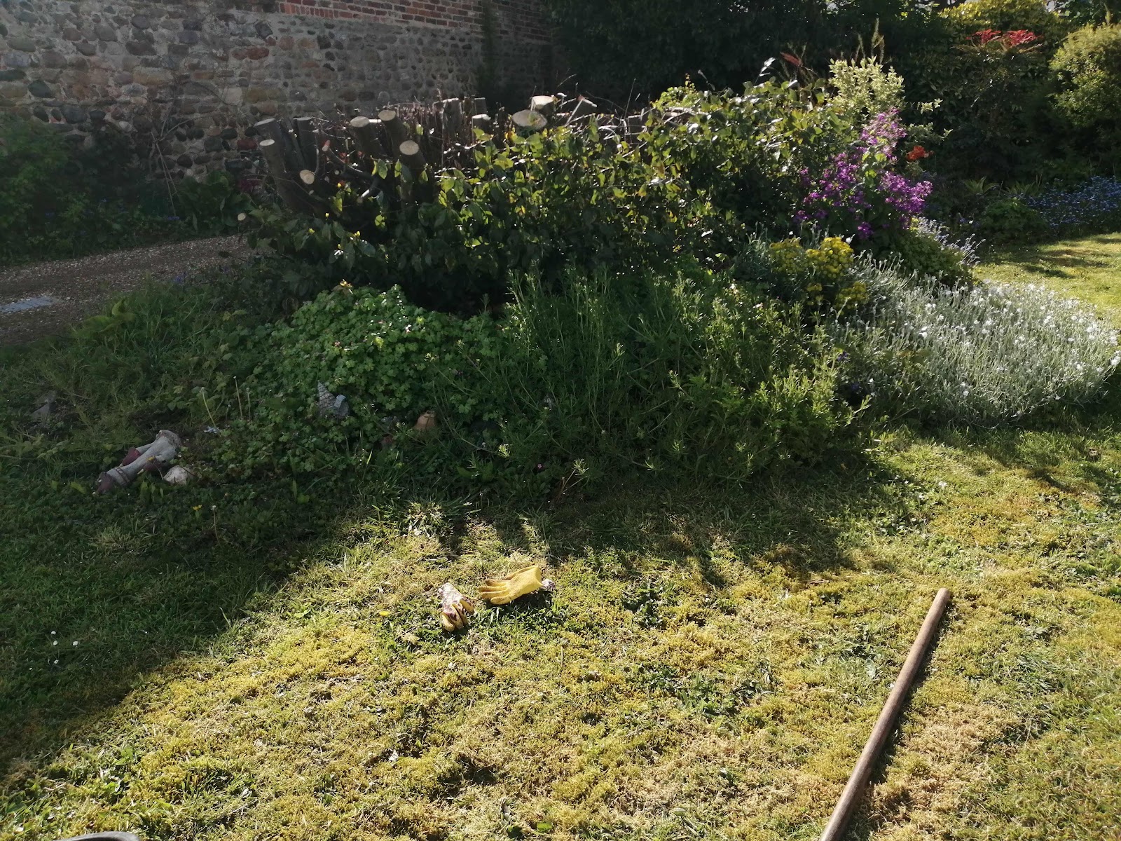 I removed the weeds and had to move all fairy garden bits and large stones onto the lawn for a while. Under the weeds were a layer of leaves which needed removing as well. This is one after which needs little more explanation!