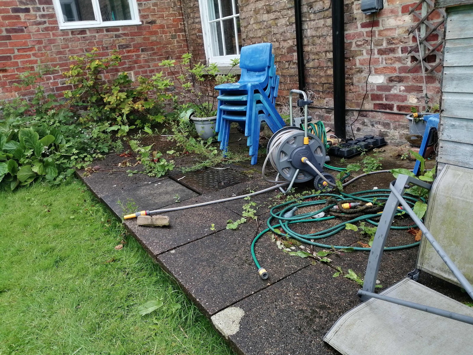 It proved to be much harder than hours of digging! Trying to get the roots out from the cracks means I can add aching arms to everything else now. I managed to get the metal swing upright and by the cupboard making a sort of screen for the garden tap. Hopefully not too many weeds will manage to grow again before Sunday!