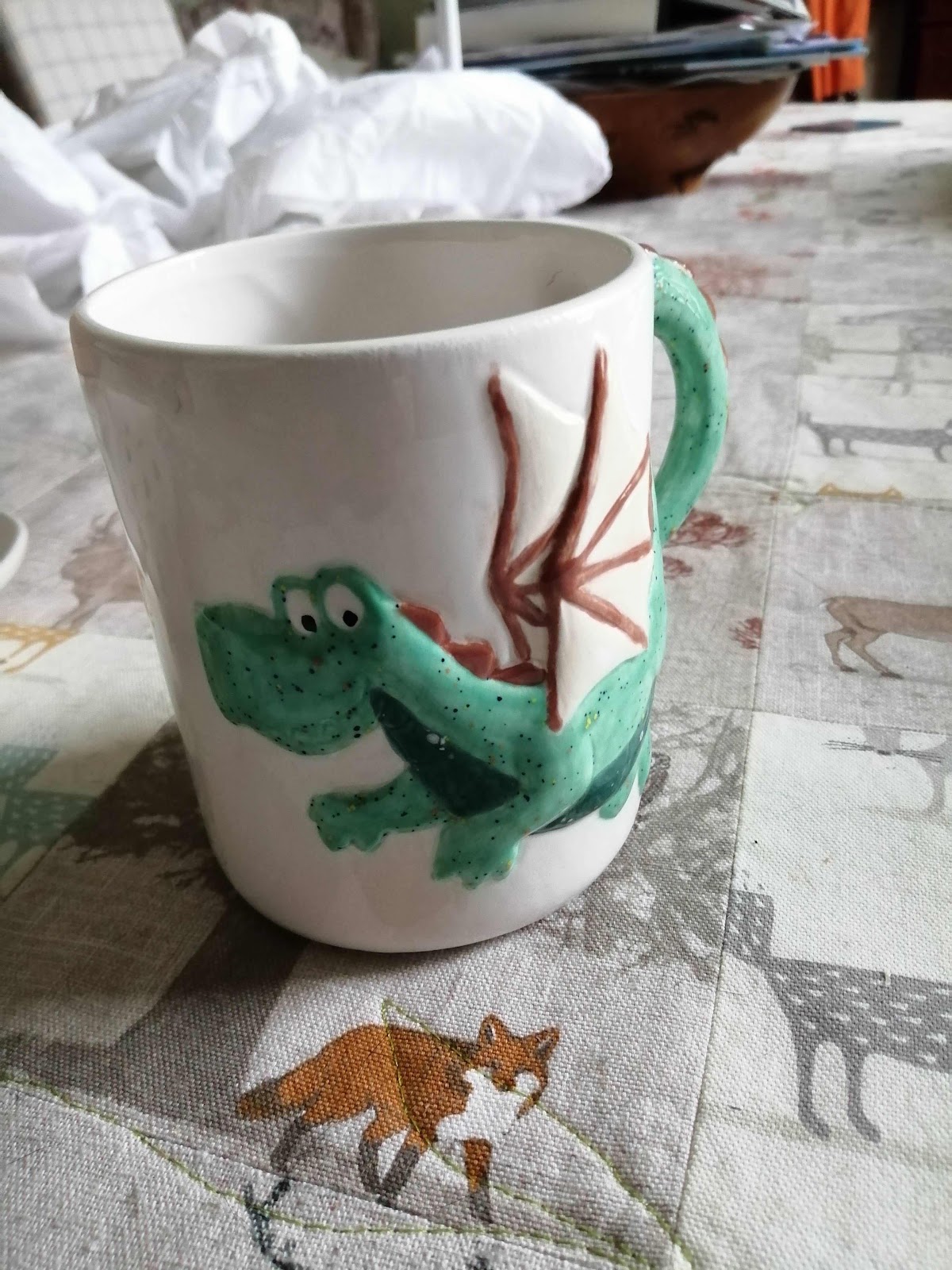 I had a couple of appointments in Beverley today. Eye test, not before time, several years since my last one. Some change but nothing too drastic, the eye health check was good. I had some lunch and did a bit of shopping as the other appointment was later. Ears this time as I have been needing the tv turnred up a bit and sometimes miss things in conversation. So another bit that needs some assistance. Very nice lady and both ears are affected. So now have hearing aids on order as well. The joys of getting older.Rosie called by today with the pottery Tina and I painted when we went with them to a pottery painting place. Tina painted a dinosaur mug and I painted a plate.