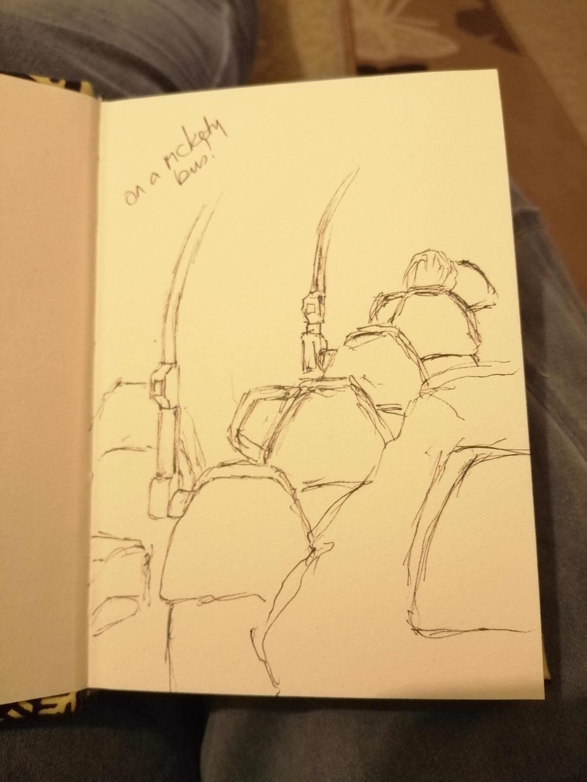 I think the sketch on the bus is pretty good. A lot of detail in there and considering it was on a bus I think you did well! I couldn’t draw like that even if I was stationary!