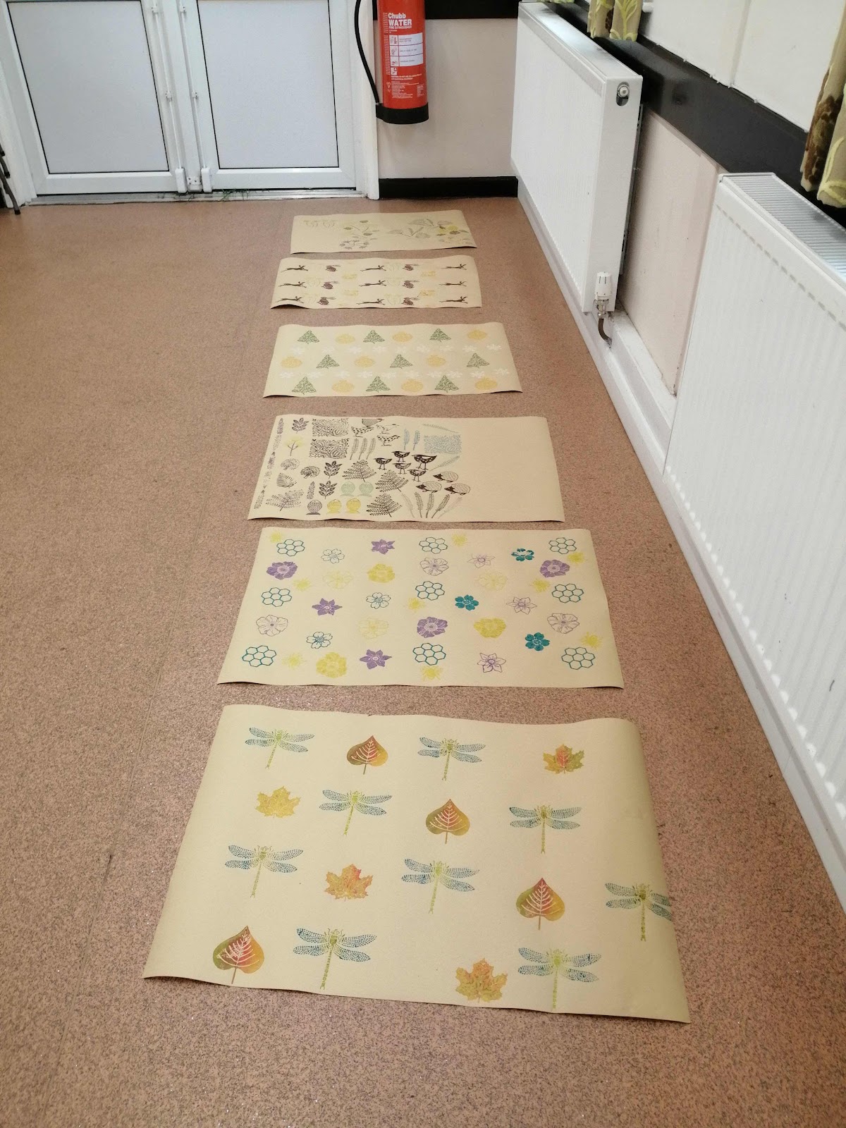 For my birthday Anya got me a voucher to use at Beehive Well-being who run craft workshops. Although there are courses in the Hull area they are all on a Sunday so no good for Tina, and the venue is not easily accessible on public transport. So I booked a session for us both in Knaith which is a village in Lincolnshire. We set off before eight as it started at 9.30am. It was a pleasant trip and we arrived on time, just two other ladies attended. Louise, who was running the workshop was lovely and had an impressive number of blocks and a good range of fabric paints. We practiced on sheets of paper, a photo of the drying sheets and photos of my two sheets.