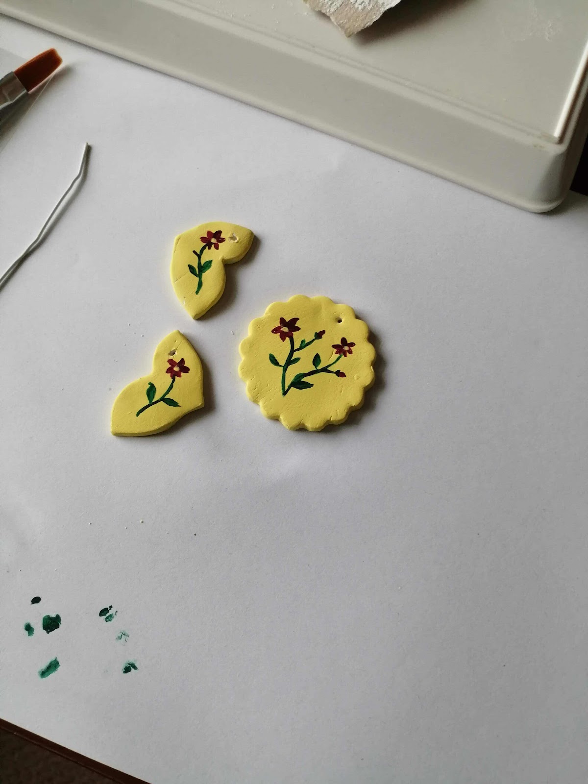 I went out to the post box and shop but otherwise have been indoors. I used very fine sandpaper to smooth the small pieces I made with the air dry clay then painted them. This afternoon I added. Bit of decoration, I will varnish them as I think they are too fragile to add and findings to.