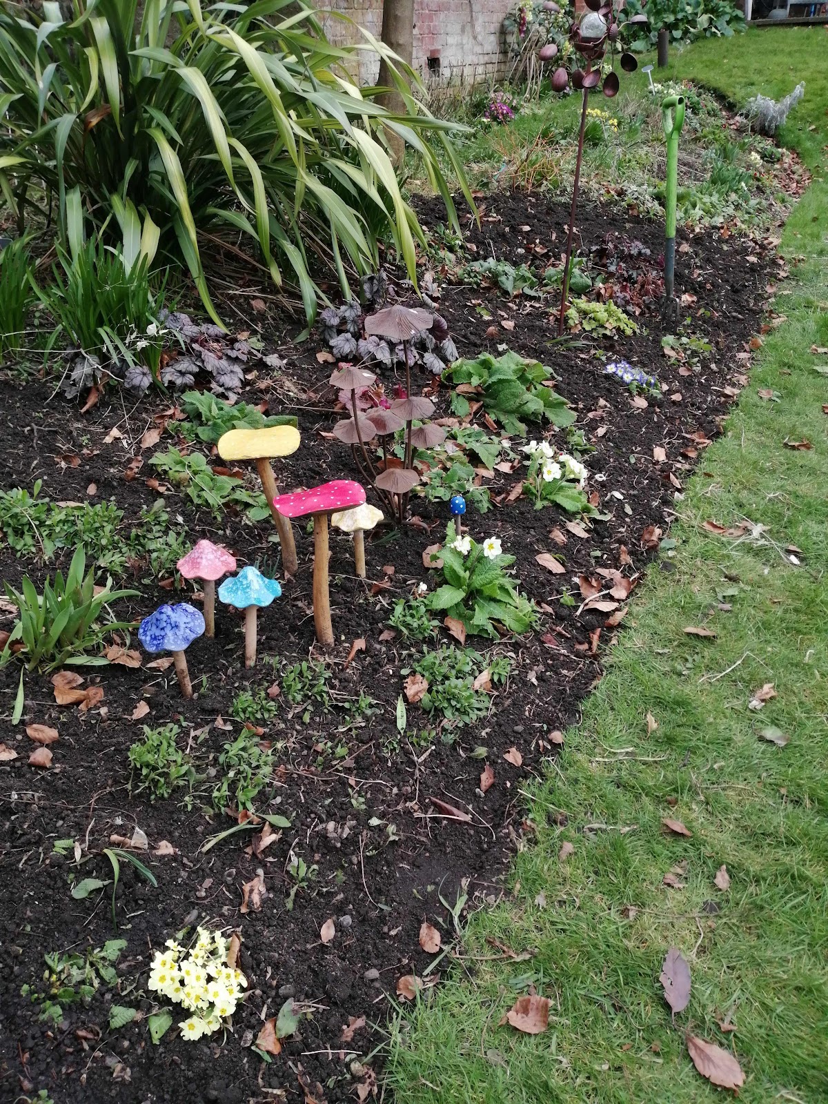 The are behind the large cordyline was very grassy and ground elder everywhere so. Lot of digging involved again today. I moved quite a few plants replanted them, and of course hd to move lo the toadstools! So I spent a good couple of hours again.