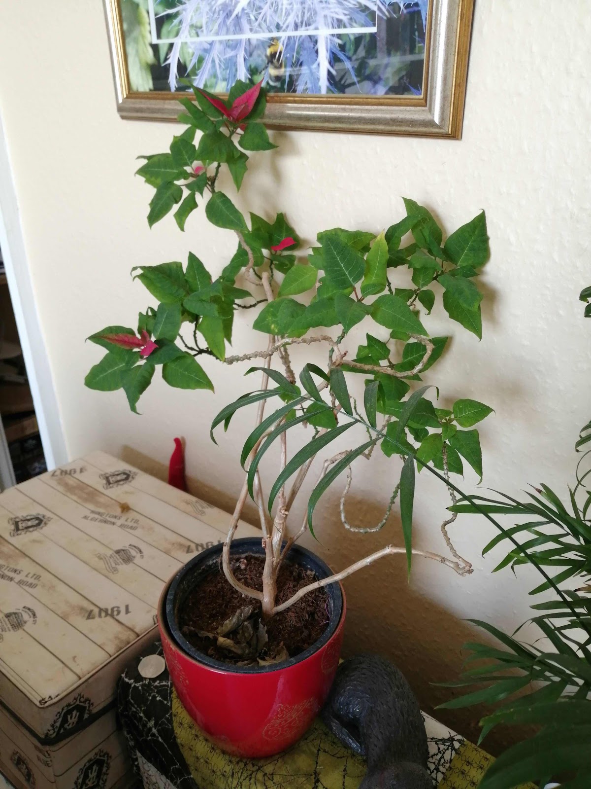 I’m sure they treat Christmas plants and trees with some sort of chemicals that kill them off after a while so you can’t keep growing them, ensuring return business for them next year! Stick with your old leggy thing. I think it looks good and it still provides you with a nice bit of colour 🙂